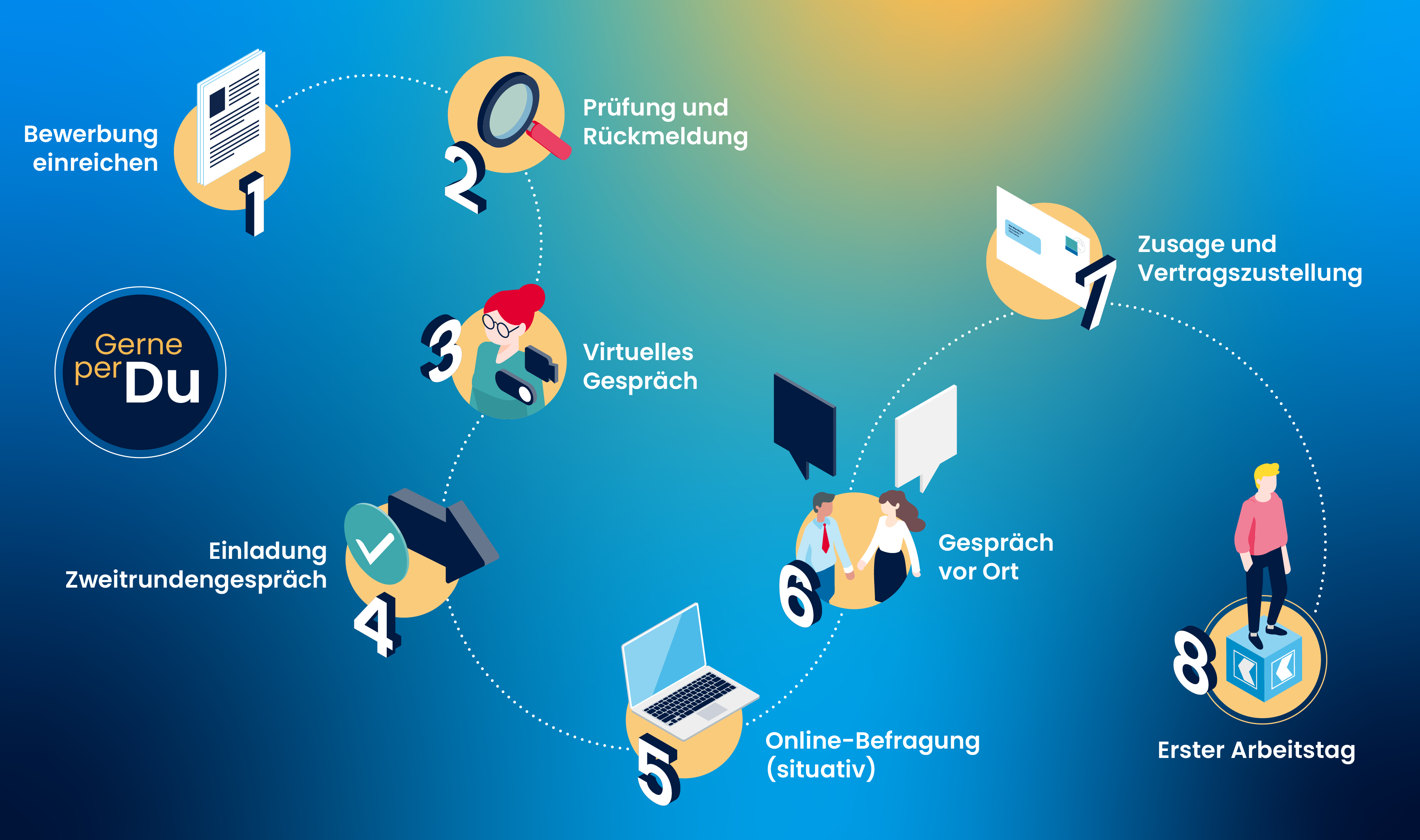 Wenn das Erstgespräch erfolgreich war, möchten wir dich in einem zweiten Gespräch gerne näher kennenlernen. Hierfür erhältst du eine Einladung zum Zweitgespräch und gleichzeitig eine Einladung zu einer Online-Befragung.
